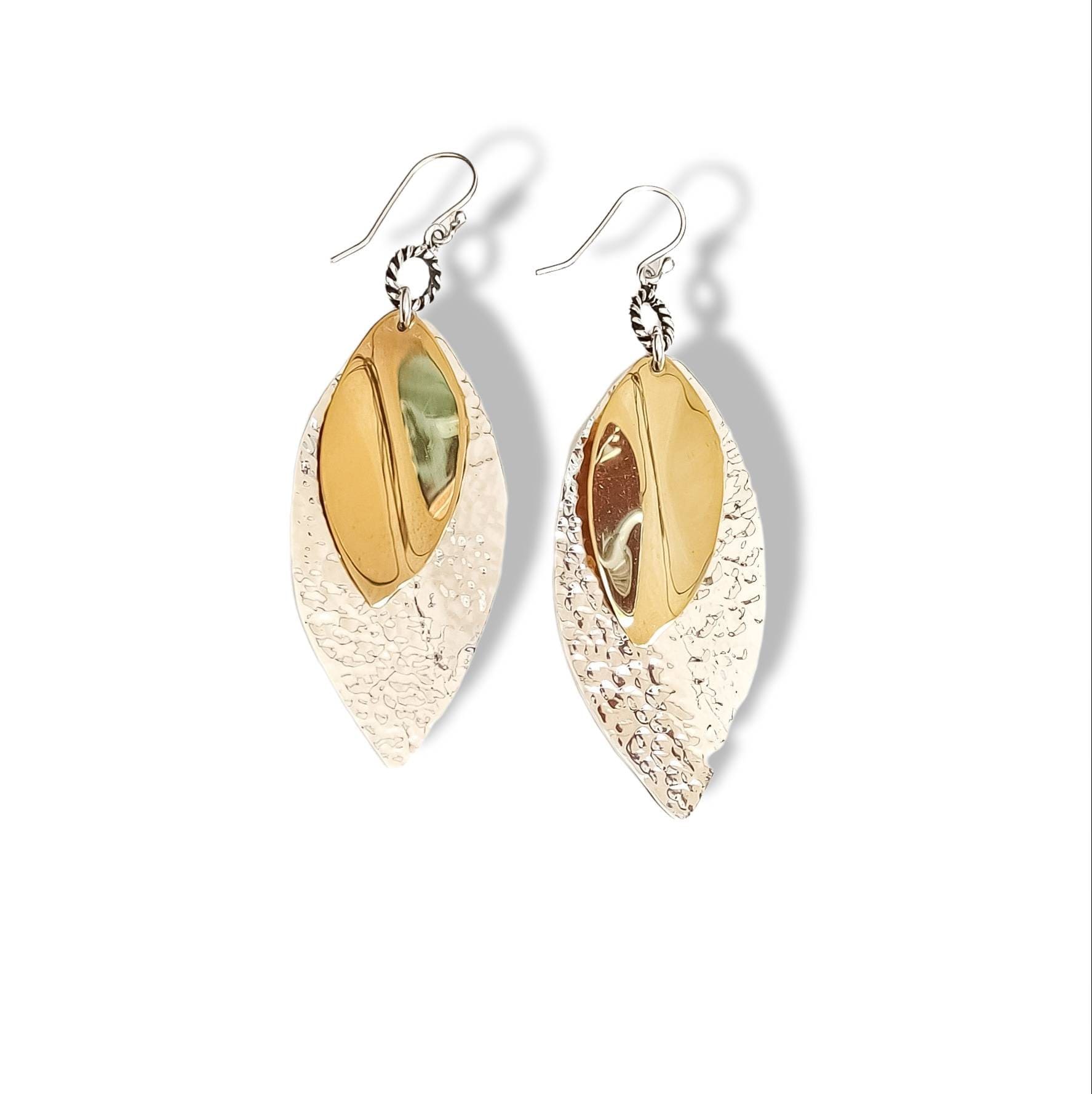 The golden song of autumn is exemplified by the symbolic design of our doubled leaf jewelry. Stacked and graded for a layered effect, the smaller gold-plated leaflet and its larger hammered leaf companion give these sterling silver earrings a double-stacked dimension.
